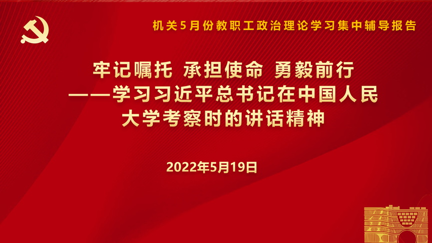 5月19日,国际发展合作研究院全体教职工参加了以“牢记嘱托 承担使命 勇毅前行——学习习近平总书记在中国人民大学考察时的讲话精神”为题的机关5月份教职工政治理论学习集中辅导报告会,会上传达了要学习习近平总书记在中国人民大学考察时的重要讲话精神。在五四青年节即将到来之际,习近平总书记到中国人民大学考察调研并发表重要讲话,充分体现了对教育工作的高度重视、对广大青年的殷切期望,要认真学习领会。习近平总书记强调“为谁培养人、培养什么人、怎样培养人”始终是教育的根本问题。要落实党的领导,坚持马克思主义指导地位,坚持为党和人民事业服务,落实立德树人根本任务,传承红色基因,扎根中国大地办大学,走出一条建设中国特色、世界一流大学的新路。