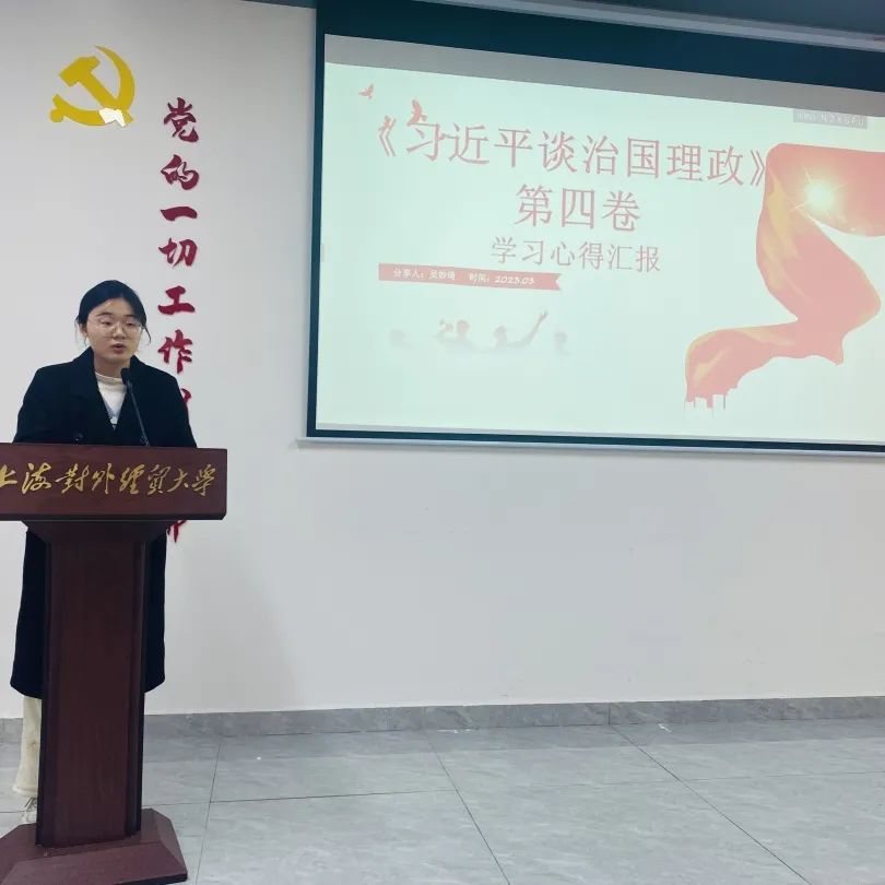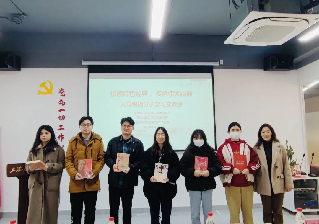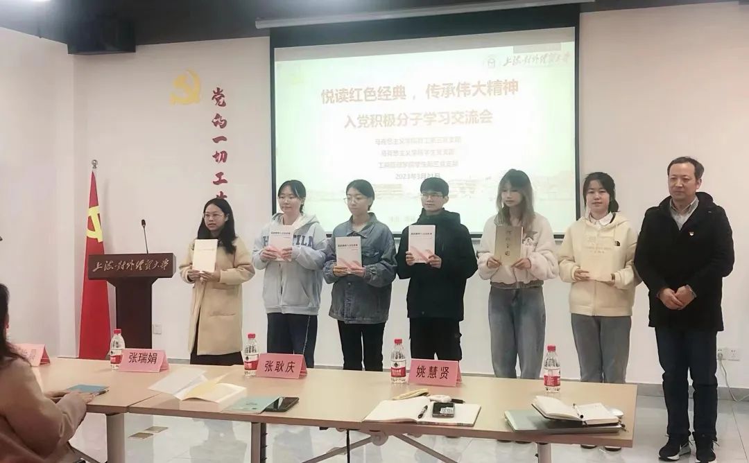 随后,工商管理学院入党积极分子胡高娥、孟优分别以《弘扬伟大建党精神,争做新时代追梦人》为主题,结合《习近平在上海》、《当好改革开放的排头兵——习近平上海足迹》进行红色书籍读书感悟分享。马克思主义学院入党积极分子孙敏慧、吴妙琦分别就《以青春之名,担时代之责》、《感悟中国之理的思想精髓》进行读书分享交流。未来属于青年,希望寄予青年。新时代青年责任在肩、使命崇高,应当在红色经典中汲取精神动力和智力支撑,勇于成为建设社会主义现代化国家的排头兵。