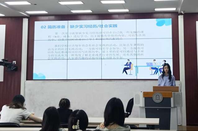王祎璠学姐以“实习与就业准备”为主题,从就业准备、简历准备、面试技巧、实习收获四个方面进行了详细的分享。她首先强调了就业准备的重要性,提醒同学们要明确自己的实习目的和发展方向。在简历准备方面,她分享了如何撰写一份突出个人优势和特点的简历,以及如何通过简历展示自己的专业技能和工作经验。在面试技巧方面,她结合自己的求职经历,分享了一些实用的面试技巧和注意事项。最后,她还分享了自己在实习过程中的收获和体会,鼓励同学们珍惜实习机会,积累实践经验。