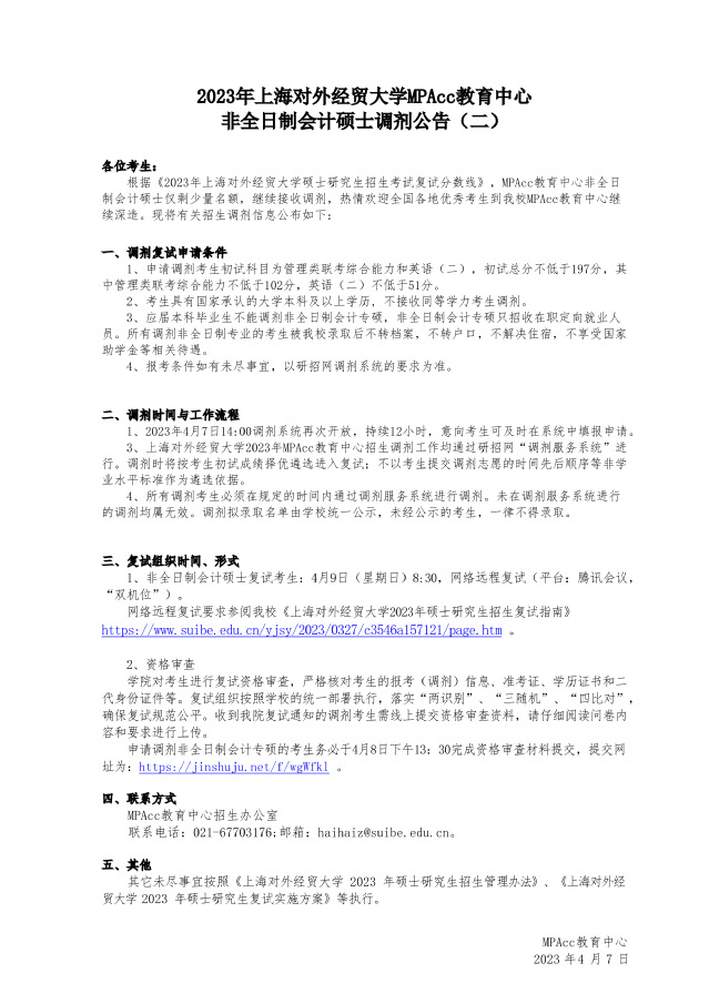 2023年188宝金博安卓app下载MPAcc教育中心非全日制会计硕士调剂公告(二)