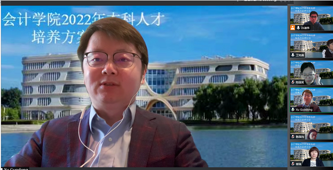 人才培养方案和教学计划是实现人才培养目标和基本要求的总体设计,是组织本科教育教学工作的重要依据。为进一步深化教育教学改革,全面落实立德树人根本任务,促进专业内涵建设,提升人才培养质量,会计学院按照学校的部署和安排,2022年5月21日上午10点通过在线会议的形式召开了“2022年本科人才培养方案研讨会”。出席本次研讨会的校外专家有北京工商大学杨有红教授,上海财经大学朱凯教授,AACSB中国区负责人徐国栋先生。校内出席人员有会计学院院长裴瑱教授、副院长孙淑伟副教授、审计系主任王如燕教授、会计系主任鲁瑛均副教授、学院教学指导委员会主任赵世君教授以及6位教师代表。该会议首先由院长裴瑱教授致辞。接着王如燕教授和鲁瑛均副教授分别对专业培养方案进行介绍。最后由三位校外专家反馈建议。