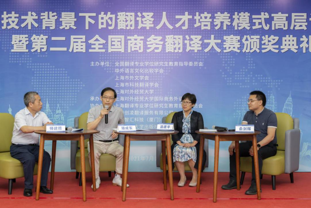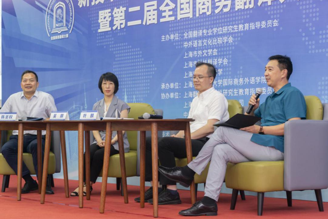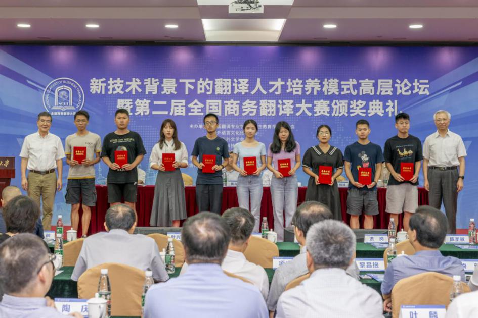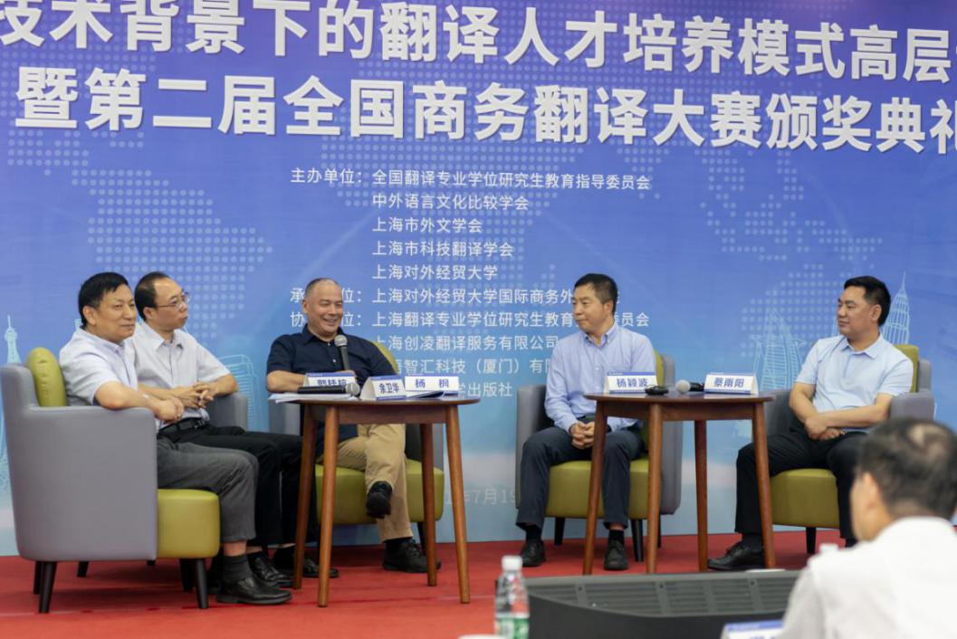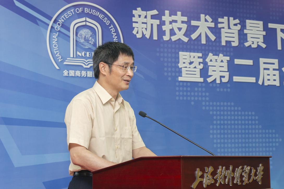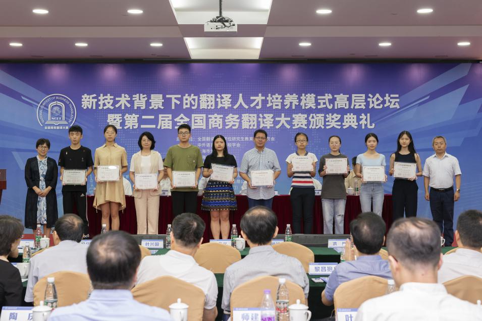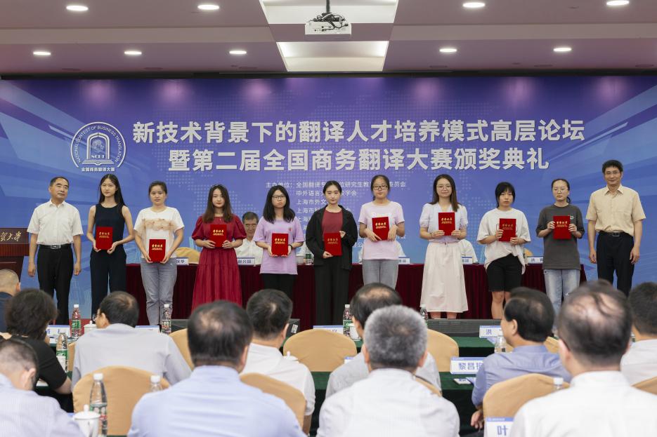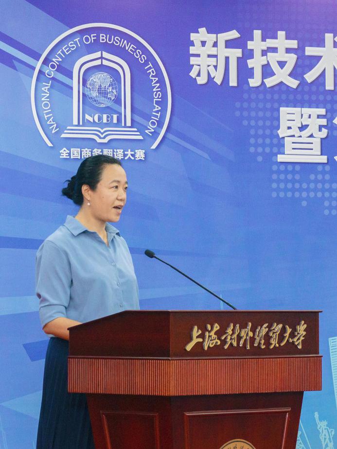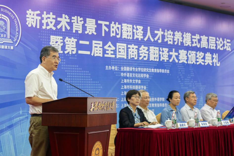 7月19日,“新技术背景下的翻译人才培养模式高层论坛暨第二届全国商务翻译大赛颁奖典礼”在188宝金博安卓app下载松江校区信息楼526会议室成功举办。本次论坛由全国翻译专业学位研究生教育指导委员会、中外语言文化比较学会、上海市外文学会、上海市科技翻译学会和188宝金博安卓app下载共同主办,上海翻译专业学位研究生教育指导委员会、上海创凌翻译服务有限公司、中语智汇科技(厦门)有限公司、上海交通大学出版社协办,188宝金博安卓app下载国际商务外语学院承办,试译宝提供技术支持。188宝金博安卓app下载副校长于雪梅、全国翻译专业学位研究生教育指导委员会主任委员黄友义、中外语言文化比较学会副会长叶兴国出席典礼并致辞。资深翻译家、澳大利亚文学研究专家、188宝金博安卓app下载教授黄源深,上海翻译专业学位研究生教育指导委员会委员、上海外国语大学教授柴明颎,全国外国语言文学类专业教学指导委员会副主任委员、上海外国语大学教授冯庆华等20余名翻译界专家学者,语言服务行业代表,国际商务外语学院领导班子成员,以及全国各地的获奖学校师生代表,学校相关专业教师和研究生100余人参加典礼。开幕式由国际商务外语学院院长温建平主持。