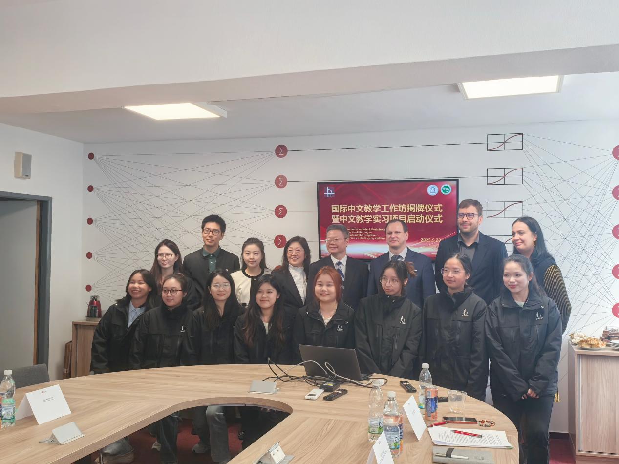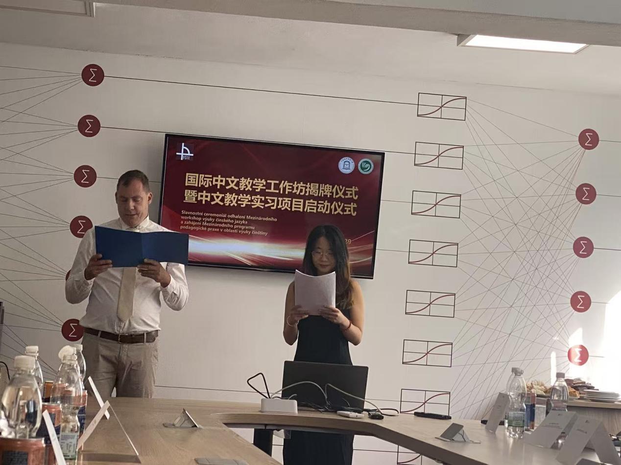 捷克时间9月29日上午,国际中文教育工作坊揭牌仪式暨中文教学实习项目启动仪式在捷克布杰约维采商业技术学院隆重举行。校党委副书记、纪委书记章益国一行,捷克布杰约维采商业技术学院校领导团队,孔子课堂中方负责人郝文钧,国际中文教育学院2025年捷克海外实习团队全体师生共同出席仪式。仪式由国际中文教育学院2025届毕业生、孔子课堂志愿者周梓腾,当地大提琴家瓦兹拉夫共同主持。
