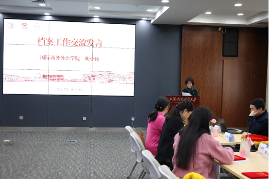国际商务外语学院胡小纯、图书馆张亚丽、招投标办公室张丽代表优秀兼职档案员交流发言。胡小纯从档案归档时间、归档内容等四个方面讲述了自己的体会。张亚丽认为档案管理是一项管理性、服务性、政治性的工作;一本本档案记录的不只是纸上的内容,也是学校和各二级单位的成长史和发展史。张丽表示,这两年来的档案工作让自己体会到,做好任何一项工作,都需要从每一件事情上进行经验总结,不断摸索,掌握方法,提供工作效率和工作质量,不断提高业务素质和业务水平。