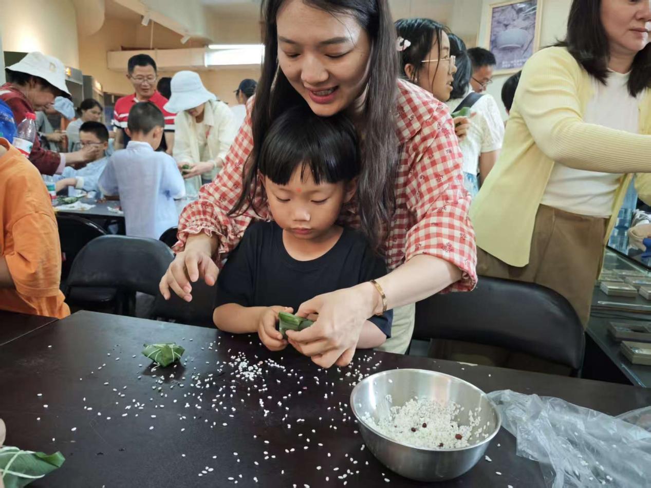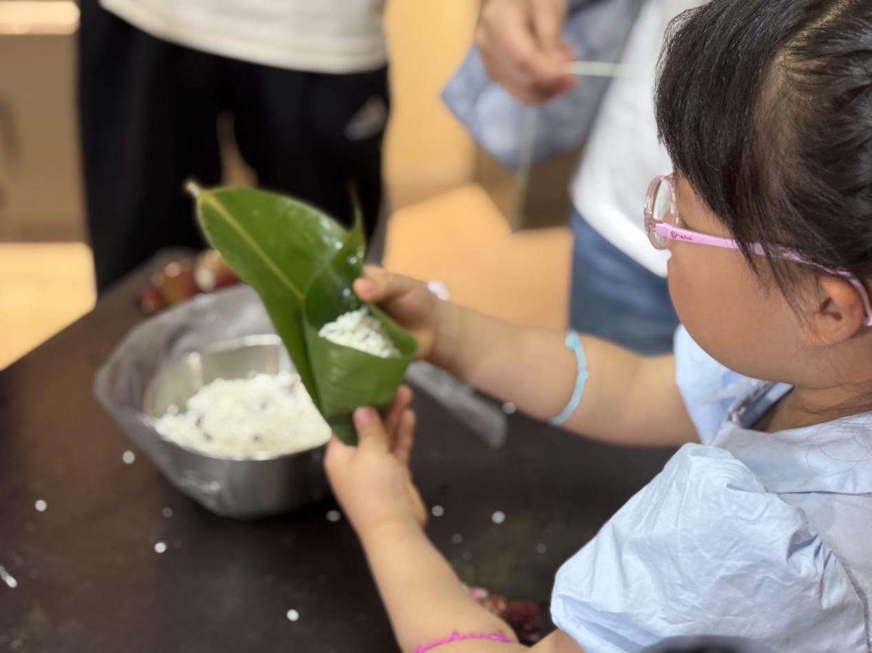 最让家长孩子们手忙脚乱又乐在其中的,是“亲子包粽大作战”。泡好的糯米、翠绿的粽叶整齐摆开,“先卷成漏斗形,米不要装太满……”老师话音刚落,现场便成了“手作剧场”,虽然包出的粽子歪歪扭扭,但这口带着手温的粽子,甜的是米,暖的是心,续的是“敬老、传承、念本”的家风。