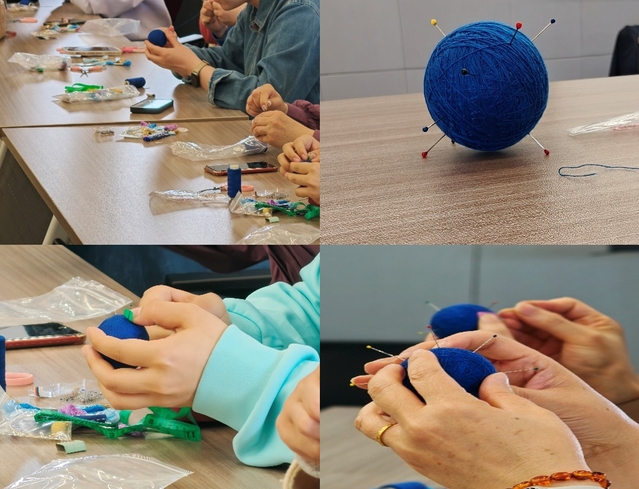 在手鞠球技艺的课堂上,指导老师详细阐述了手鞠球起源于唐代的悠久历史背景及其所蕴含的美好寓意,并对教职工进行了缠绕、分球、刺绣等基础技艺的指导。老师们通过彩线缠绕制作出精致的图案,体验到了指尖艺术的美感。该活动不仅提高了参与者的实践技能,还使他们得以近距离感受非物质文化遗产的独特魅力,从而丰富了文化生活的内容。